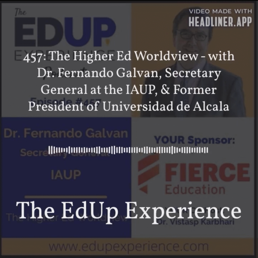 In this episode, YOUR guest is Dr. Fernando Galvan (https://en.wikipedia.org/wiki/Fernand…, Secretary General at the International Association of University Presidents (https://www.iaup.org/)(IAUP (https://www.iaup.org/)), & Former President of Universidad de Alcala (https://www.uah.es/es/) in Madrid, Spain, YOUR guest cohost is Dr. Vistasp Karbhari ( / vistaspmkarbhari , Professor at Department of Mechanical & Aerospace Engineering at The University of Texas at Arlington (https://www.uta.edu/), YOUR host is Dr. Joe Sallustio ( / joesallustio , & YOUR sponsor is Fierce Education (https://www.fierceeducation.com/)!